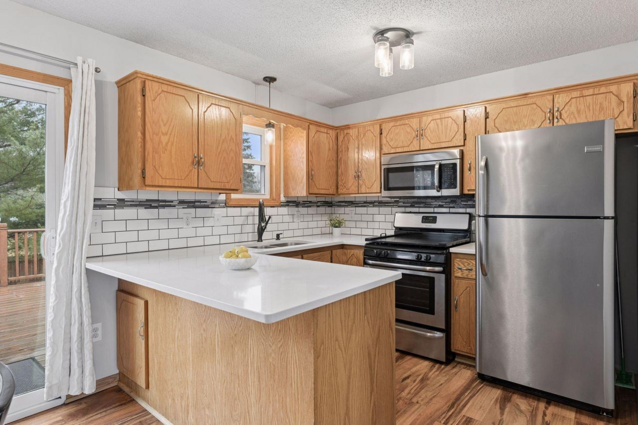 Beautifully maintained split-entry home offering 4 spacious bedrooms, 2 baths, and a 2-car garage. This move-in-ready property features numerous updates and stylish finishes throughout. The bright and inviting kitchen showcases stainless steel appliances, stunning quartz countertops, a modern ceramic tile backsplash, and an updated sink and faucet. Fresh updates throughout, including flooring in the foyer , updated flooring in the foyer, and a nicely refreshed ceramic tile bath. Step outside to a huge deck and concrete patio overlooking a fully fenced backyard?ideal for gatherings, pets, or relaxing evenings. The yard is enhanced by great landscaping, a shed, and a sprinkler system to keep everything looking its best. This home combines comfort, updates, and curb appeal?truly a must-see!