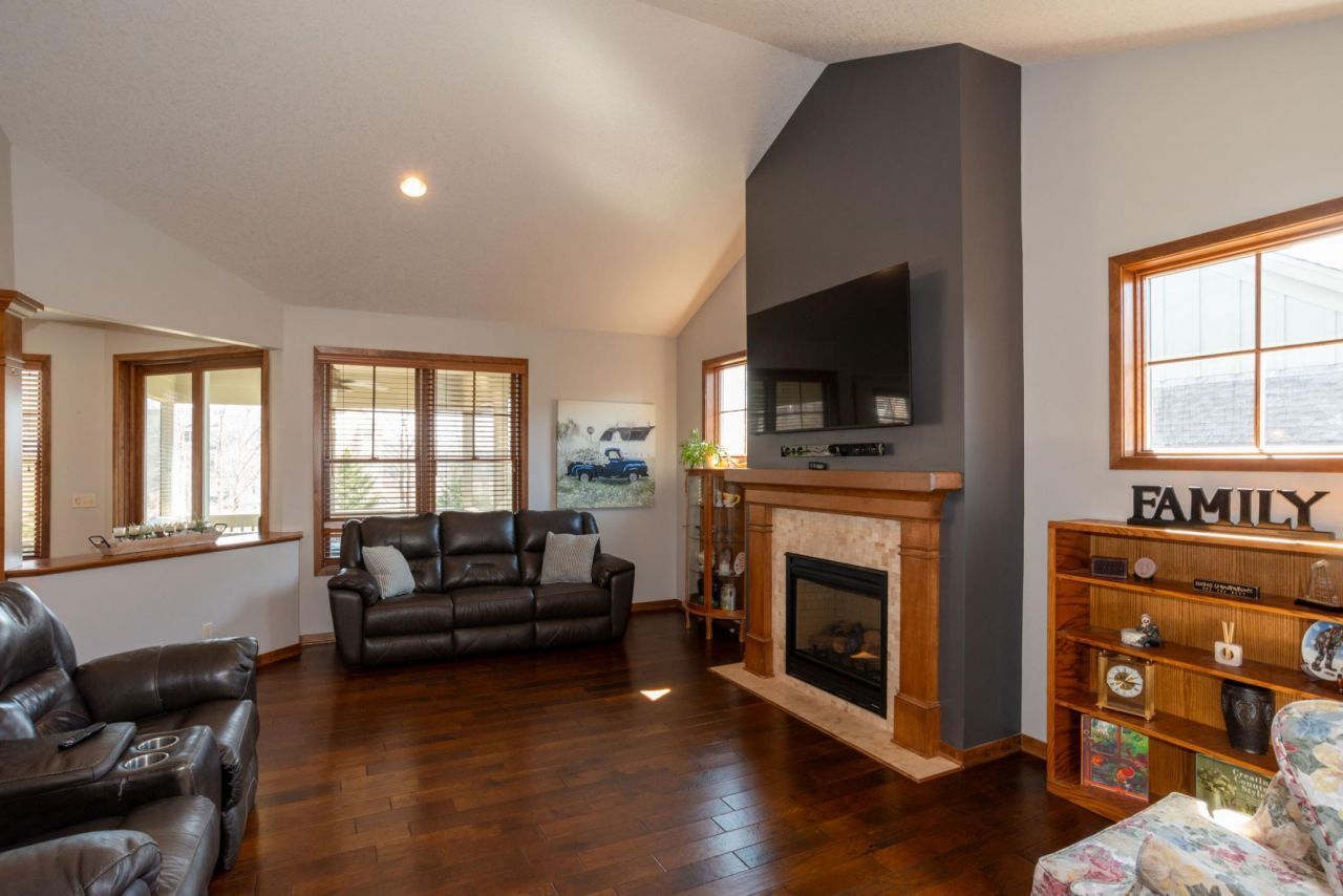 Stunning Pratt-built villa in coveted Dancing Waters! This beautifully maintained home delivers true main-level living with rich hardwoods, maple cabinetry, and sun-filled open spaces. A private office is located on the main level. The dramatic great room features vaulted ceilings and a stone fireplace, while the gourmet kitchen shines with granite countertops, a center island, and porch access overlooking the wooded backyard.The luxurious Owner's suite includes a spa bath and walk-through closet to the laundry room. The walkout lower level is an entertainer's dream? surround sound, a stone fireplace, a full wet bar, two bedrooms, a ¾ bath, and a huge bonus room.Enjoy a maintenance-free decking in the porch, paver patio, and direct access to trails. Dancing Waters amenities?pool, playground, sport courts?are just steps away. A rare combination of privacy, quality, and community.