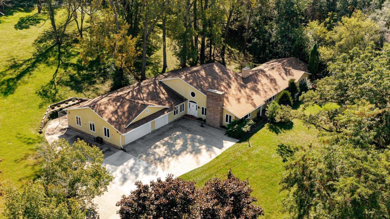 Wonderful large rambler on 2.98 acre wooded and panoramic lot. Country living near town, schools, shopping and walking trails. Pre inspected, well kept home with 5 bedrooms and 5 bathrooms, wood floors, beautiful parquet wood floors, tall ceilings, 2 fireplaces, lots of built in cabinetry, wrap around decks, large covered deck. Extra large 1120 square foot, 3 car heated attached garage with storage cabinetry and epoxy floor. The large 3596 square foot main floor features: access to decks, large foyer, large open floor plan living room and dining room with 2 fireplaces, eat-in kitchen with window seat and two way fireplace, 4 bedrooms and 4 bathrooms on main floor. Large private primary bedroom suite with full bathroom and access to decks. 3 additional bedrooms on main floor (one bedroom is a 2 room bedroom suite) and 3 additional bathrooms on main floor (half bathroom, 3/4 bathroom, full bathroom ) and a large mudroom. The Lower level features: the 5th bedroom which is a 2 room bedroom/study suite, a 3/4 bathroom, laundry, utility & storage areas.