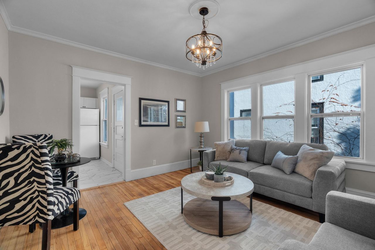Absolutely adorable cream puff perched up on a charming little hill! This home welcomes you with a fully enclosed three-season front porch ? the perfect spot to enjoy morning coffee or unwind in the evening with windows and screens to let in the breeze.Inside, you'll find newly finished hardwood floors, abundant natural light, and a cozy dining area that flows seamlessly into the living space. The spacious primary bedroom offers ample closet space, and an additional flex room connected to the living room provides great versatility ? ideal for a non-conforming second bedroom, office, workout room, den, or additional dining space.The fully remodeled kitchen shines with gleaming white cabinetry, new laminate countertops, white appliances, and durable luxury LVP flooring. Just off the kitchen is a convenient back storage porch ? perfect for coats, shoes, and everyday storage ? along with a bright, fully tiled bathroom filled with natural daylight.The unfinished upper-level expansion space offers exciting potential for future added square footage. Downstairs, the clean and freshly painted basement provides a private quarter bath area, hooks ups for washer & dryer, and a generous storage space.Enjoy the large, fully fenced backyard with privacy fencing, sidewalk access to the one-car garage featuring a brand-new garage door opener, plus additional alley access and parking.Agent owned. Move-in ready with numerous recent updates throughout ? this one is truly as cute as they come! **New garage door and openers are on schedule for install week of March 9th**
